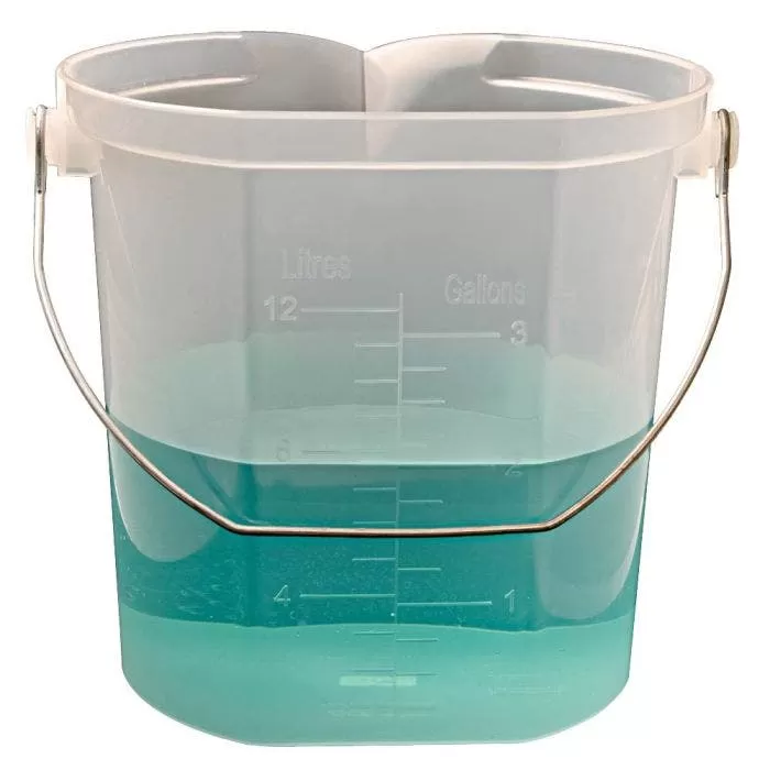 The Accu Pour 3 Gallon Measuring Bucket can measure up to 3 gallons with raised quart gradations and liter gradations up to 12 liters.