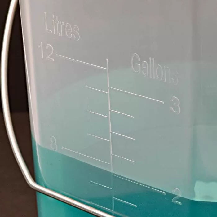 The markings on the Accu Pour 3 Gallon Measuring Bucket measure up to 3 gallons, and 12 liters with raised lettering.