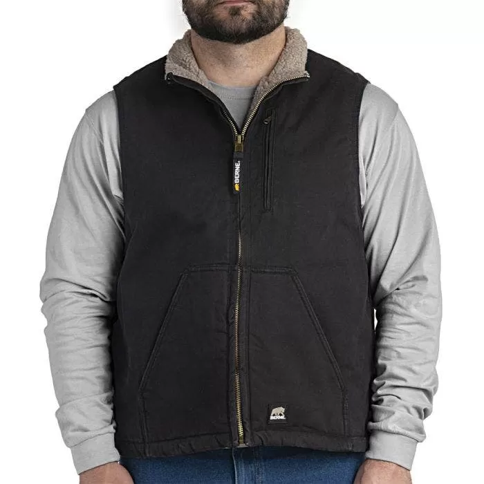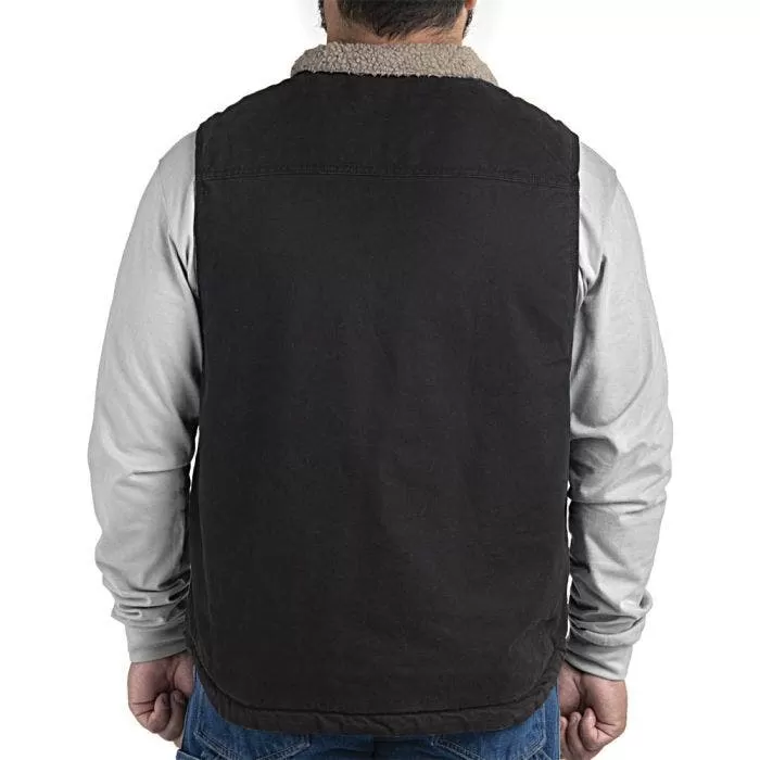 This BERNE Canyon Vest consists of a 100% cotton duck shell with a 100% polyester Sherpa-style inner liner. This size medium black vest features an extended back, an extra-large front pocket, and three inside pockets. Triple-needle stitching at the main seems, combined with reinforced bar tacks at all stress seams, maximize durability.
