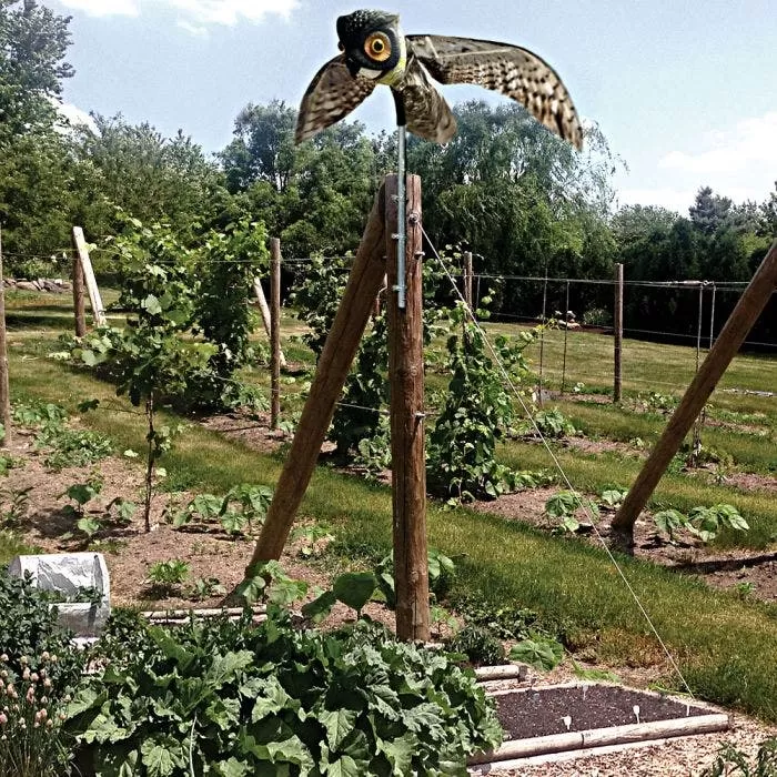 The Bird X Prowler Owl features wings that move in the wind, creating a constantly shifting appearance that makes it difficult for birds and small animals to acclimate. Its appearance and movement mimic that of a great horned owl, a natural predator, which scares away other birds and small animals.