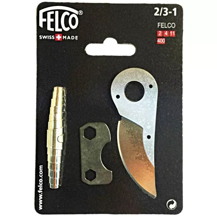 Each set contains one blade, spring and adjustment key for specified tool. This allows for the full replacement of the most common FELCO replaceable parts.