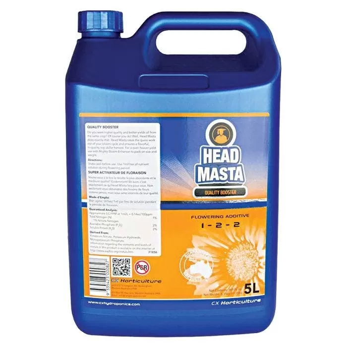 CX Horticulture’s Head Masta contains a blend of vitamins and minerals. This blend pushes your plants? natural factors beyond normal levels. This is a 5-liter container of Head Masta. Head Masta stimulates the hormones responsible for flower formation.