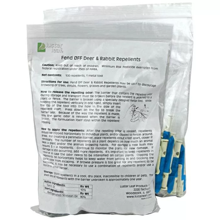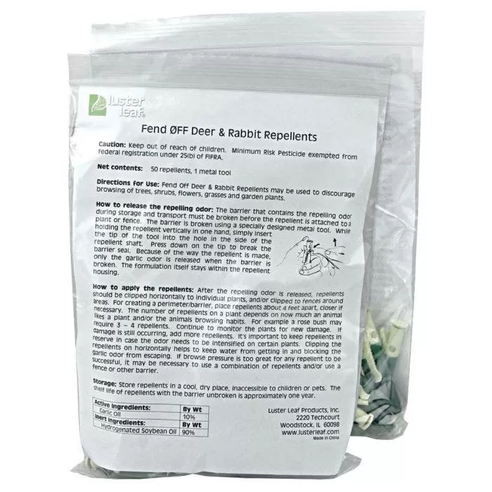 These Deer & Rabbit Repellent Garlic Clips contain organic, food-grade garlic oil. Humans cannot detect this highly-concentrated oil. It causes no harm to either plants or animals. A biodegradable plastic shell allows you to clip them directly to the plant or your fencing. Choose your desired quantity below. Use Garlic Clips to deter deer, rabbits, and other animals. Sulfur compounds in the garlic oil repel smell-sensitive animals from the area. They are also very easy to use. Just break the seal with the enclosed metal tool and clip sideways onto plants or fences. Use one dispenser every 4 to 6 feet. Placing the clips sideways prevents water from blocking the odor. You can also place them directly on the ground to protect low-growing plants. Deer & Rabbit Repellent Garlic Clips are a safe alternative to harsh chemicals or traps. Unlike traditional treatments, they require no repeat sprayings or applications. Each clip lasts from 6 to 8 months, their biodegradable shell reverts to compost within a few years. Pick up some today and keep animals away from your prized plants!