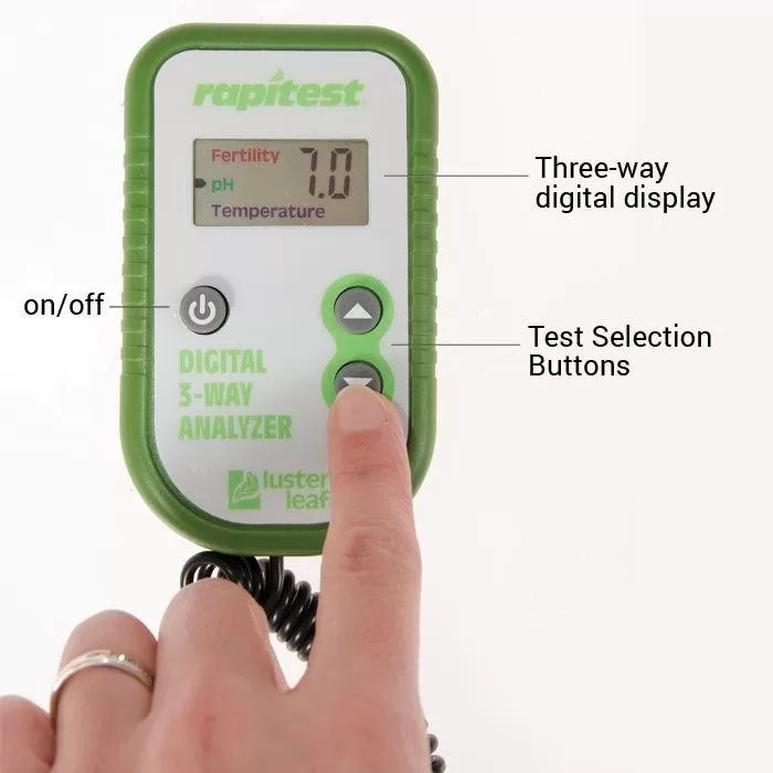 The Luster Leaf Rapitest 1835 digital 3-way soil analyzer will help you get the proper readings for pH, fertility and temperature. With just a couple touches to the digital analyzer you will have your information for optimal plant growth.