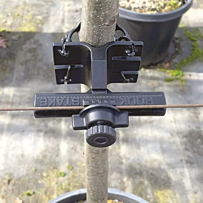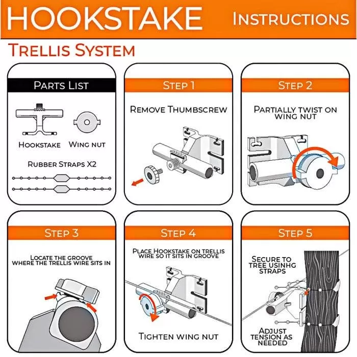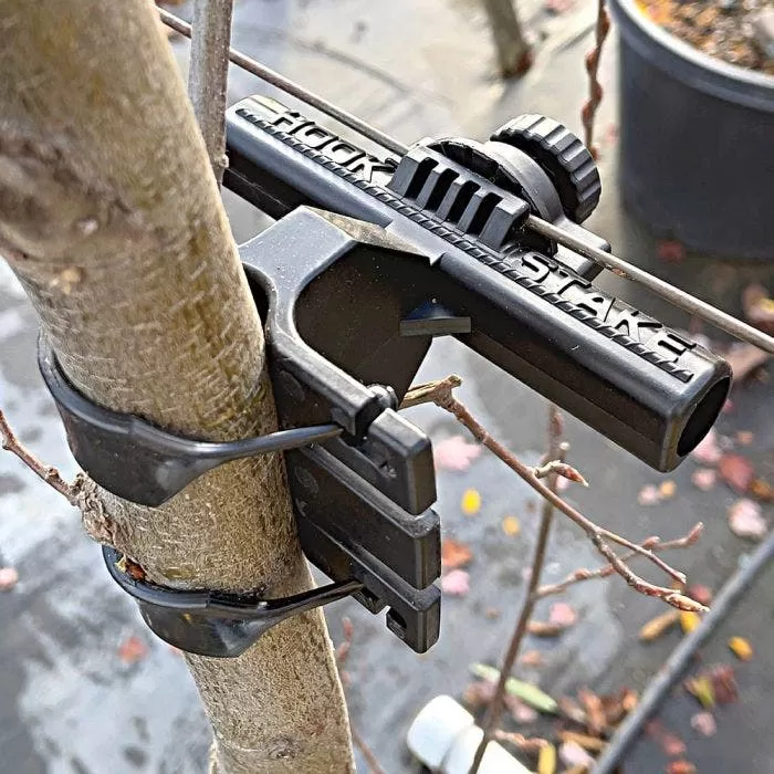The HookStake Trellis attaches to existing trellis wires using the included wing nut. The patented design allows you to easily adjust plant spacing or completely remove in a matter of seconds with no tools required. The adjustable straps can fit trees from 0.5-inch to 3-inch caliper. The UV resistant straps protect trees from scarring caused by alternative options. Faster and more efficient crop rotation.