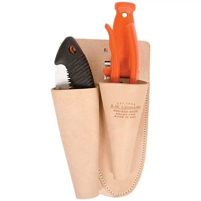 The Leonard Deluxe Soil Knife, Pruner, Saw, and Sheath combo gives you everything you need to complete most gardening tasks. Our Deluxe Soil Knife is great for weeding, cutting roots, and removing rocks. Use our Traditional Bypass Pruners to make short work of limbs and branches up to 1 inch in diameter. Finish up with the Tri-Edge Folding Pruning Saw to get rid of bigger branches. The high-quality leather sheath keeps all three tools safe and within reach.