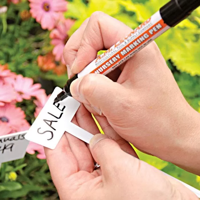 The Leonard Long-Lasting Nursery Marker Pen features a fine felt tip and a metal housing. This black marker is waterproof and permanent. It dries nearly instantly and leaves a non-smearing mark. A snug-fitting cap prevents the marker from drying out. This nursery pen marks on anything but is best for plastic tags and labels. The ink will not wash off, nor will it fade in sunlight. To open the pen, hold the cap with one hand and the pen with your other hand. Simultaneously pull and twist the lid clockwise. Even those expensive name brand permanent markers fade if left in the sun. The Leonard Nursery Marker Pen outlasts all others!