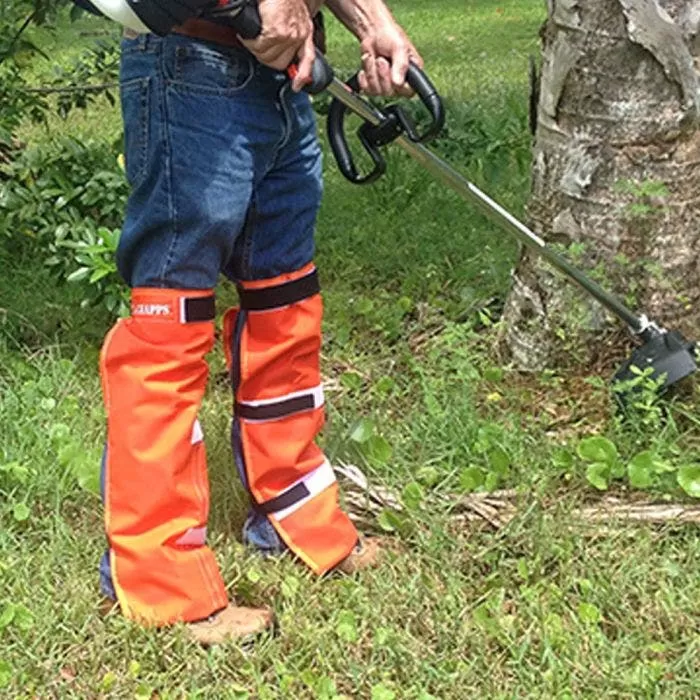 String trimmer protection. Strap Chaps protect from the top of the knees down to the top of the feet and secure around the legs with elastic straps and Velcro fasteners. They protect the front and sides of the leg, leaving the back slightly open. Fully adjustable system allows each chap to fit different lengths. Choose from either orange (SC06) or dark green (SC09), one size fits all. Sold as a pair.