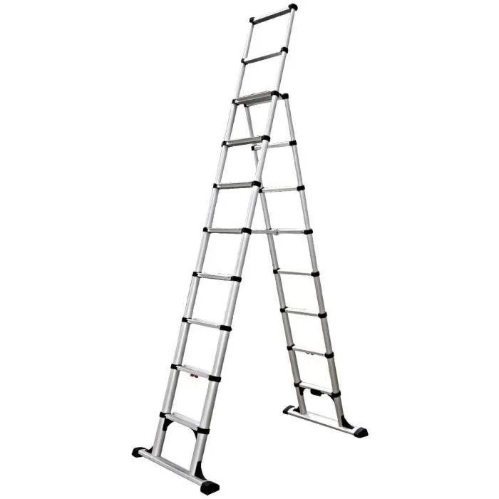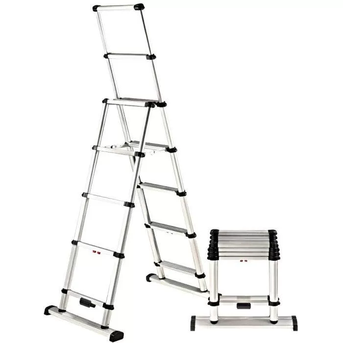 Telesteps Professional Telescoping Combination Ladders combine an extension ladder, A-frame ladder, and step ladder in one lightweight package. These multi-function ladders feature a high-quality, aircraft-grade aluminum alloy construction. The fully automatic extension steps lock from the bottom up and each step has a built-in safety indicator. Each ladder has a wide stabilizer bar at the base in addition to two extended top rungs for extra support at the top. Choose your desired ladder height below. Telesteps Professional Telescoping Combination Ladders allow you to reach multiple heights with just one ladder. When used as an extension ladder, the two top rungs provide extra height. The A-frame option provides a wide base for free standing use as a step ladder. An offset feature enables you to use the A-frame ladder on stairs or other uneven surfaces. These ladders are ANSI 14.2 tested, OSHA-compliant, and type IAA rated to support up to 375 pounds! Telesteps makes products that are perfect for both professionals and homeowners. These lightweight ladders are no exception. Once you finish the job, Telesteps’ patented one-touch release mechanism automatically retracts the ladder for fast and easy storage. Telesteps covers these products with a 1-year warranty against manufacturing defects.