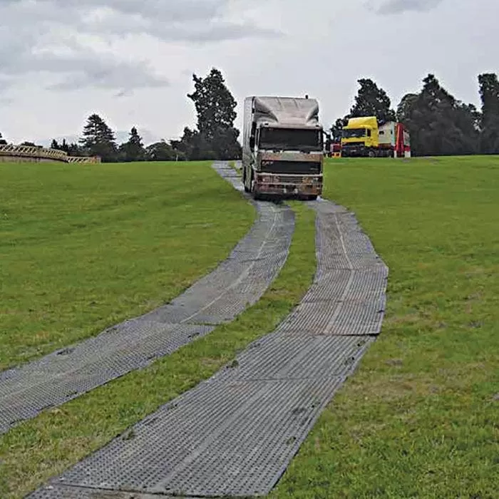 Commercial Grade ground protection mats, TrakMAT is ideal for the Green Industry. Designed to move large vehicles and heavy equipment over lawns, sidewalks, driveways, and more without causing damage. Supports loads up to 180,000lb or 90 tons. Great for general landscaping and construction equipment of any size. Featuring a Power Cylinder tread surface on both sides. This popular tread pattern provides maximum contact tire (track) to mat, and mat to ground contact. While leaving sensitive ground unscathed. TrakMAT will also prevent vehicles and equipment from getting stuck in wet, muddy, unstable ground conditions. Made of 1/2-inch thick polyethylene that is easy to clean, chemical and oil resistant. Unaffected by extreme temperatures, hot or cold. UV protection prevents degradation, and the matte surfaces reduce sun glare. Available in 36″ x 96″ and 44-1/2″ x 96″ sizes. The unique 44-1/2″ wide size is the lightest “full-size” ground production mat available at 78lb. Manufactured from 100% recycled High Density Polyethylene (HDPE). TrakMAT features hand hold cutouts for easy deployment and maneuverability. And pre-drilled holes for mat connecting hardware, HDU-2 and HDU-4. Available in green and black. 6 Year Limited Warranty. MOTOR FREIGHT DELIVERY.